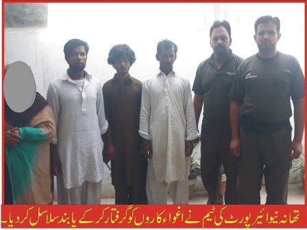 15کی اطلاع پر کہ مسماۃ ف ن بعمر18/19سال سکنہ دیھ کھیری مورت سے چار اغوا ء کااران نئیر شہزاد ولدمختیار احمد، مختیار احمد ولد خادم حسین،زوجہ مختیار احمد،ساجد عمران ولد ارشاد گاڑی نمبری MNS5067برنگ سیاہ میں اغوا کر کے لے کے جارہے ہیں جس پر تھانہ نیو ائیر پورٹ کے آفیسر اقبال اے ایس آئی نے بروقت کاروائی کرتے ہوے گاڑی کا پیچھا کر کے اغواء کاروں سے بازیاب کروالیا۔ جس پر مذکورہ اے ایس آئی نے ملزمان کو گرفتار کر کے مقدمہ درج کر لیا۔