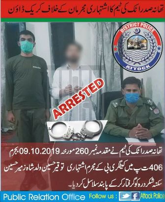 تھانہ صدر اٹک کی ٹیم نے مقدمہ نمبر 260مورخہ 09.10.2019بجرم 406ت پ میں کیٹگری بی کے مجرم اشتہاری توقیر حسین ولد شاہ زمیر حسین سکنہ شکردرہ کو گرفتار کر کے پابند سلاسل کر دیا۔