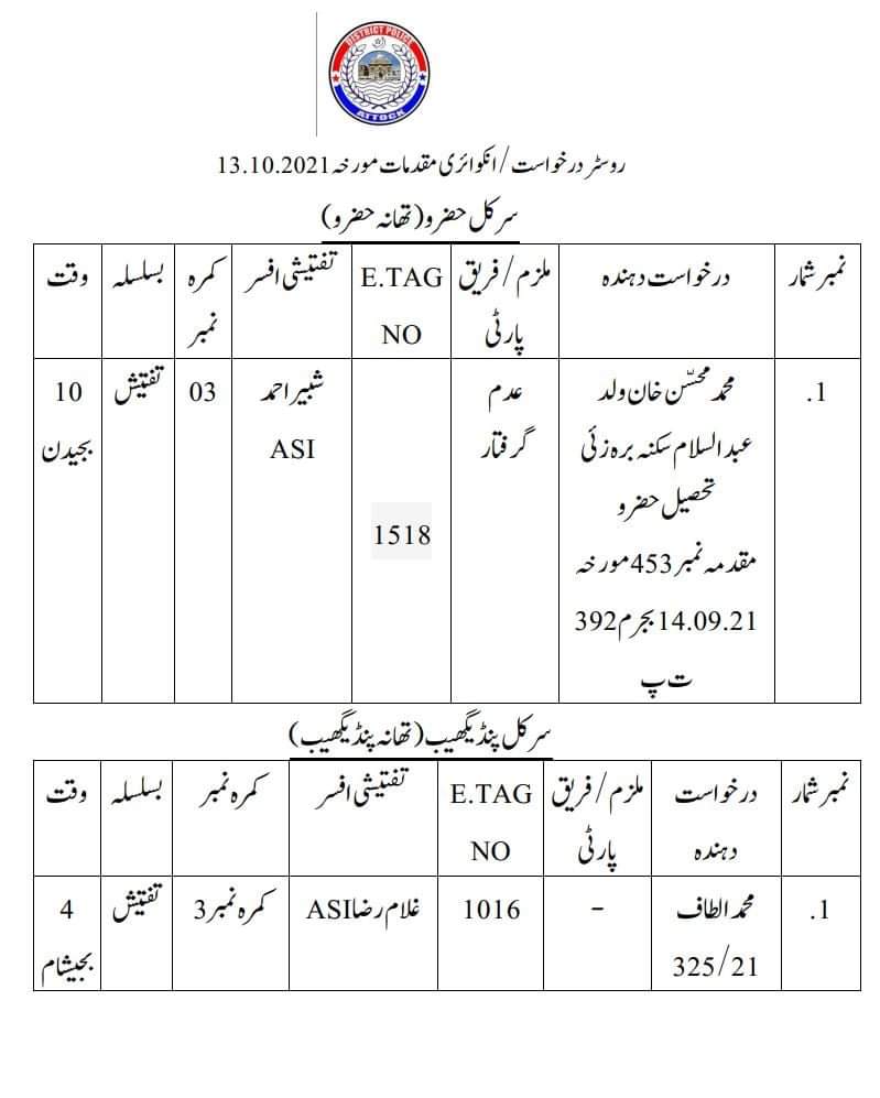 ضلع کے تمام تھانہ جات میں بسلسلہ تفتیش اور انکوائری کے لیے بلوائیں جانے والے سائلین اپنے نام نیچے دی گئیں فہرستوں میں چیک کر سکتے ہیں اسکے علاوہ بذریعہ کال سروس متعلقہ تھانہ سے بھی آپ کو آگاہ کیا جا تا ہے۔اٹک پولیس اپنے آفیشل فیس بک پیج ،ٹویٹر اکاؤنٹ اور ویب سائٹ کے ذریعہ پبلک کو تمام تر معلومات روزانہ کی بنیاد پر فراہم کر رہی ہے ۔