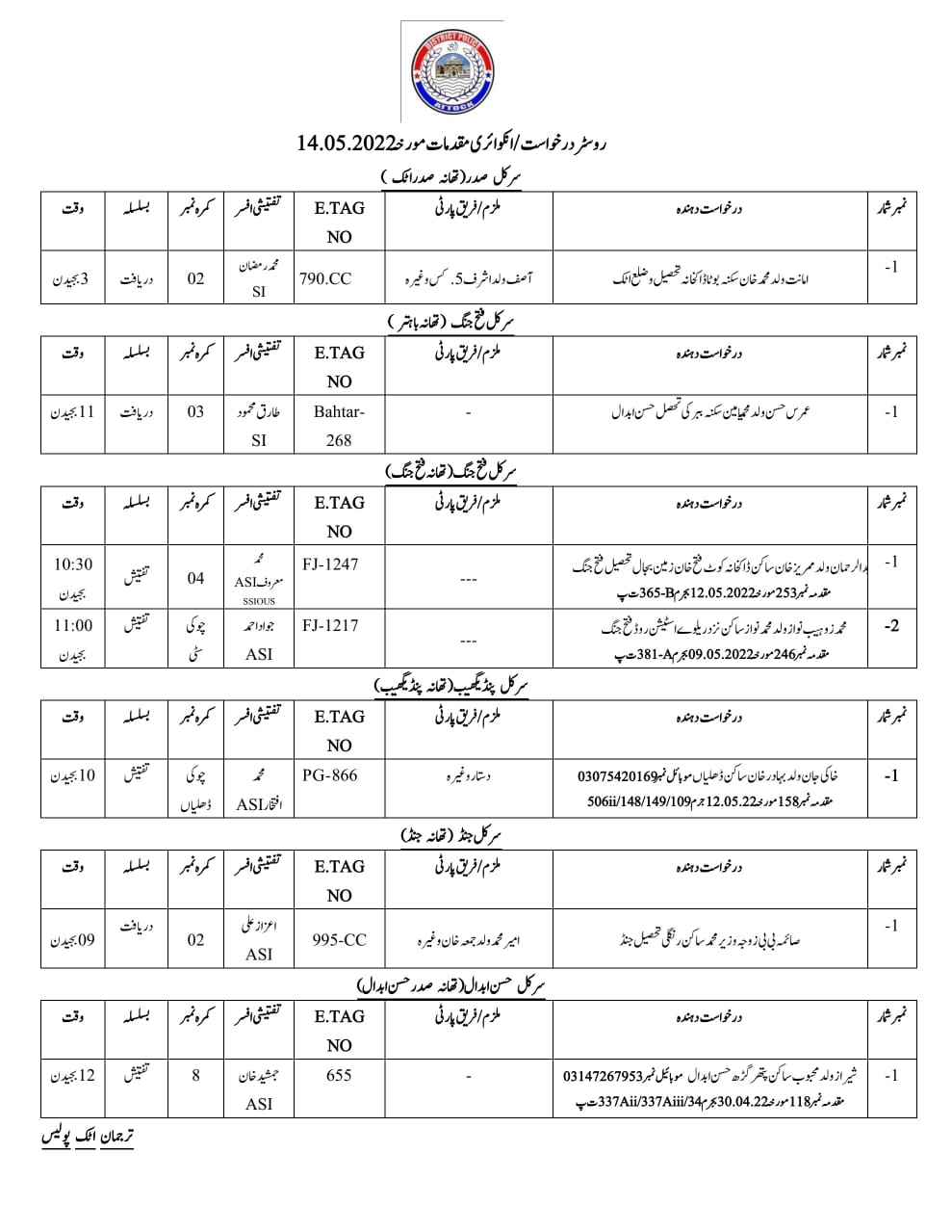 مورخہ 14.05.2022کو تھانہ جات میں تفتیش و انکوائری کے لیے طلب کیے جانے والے سائلین کے نام ذیل ہیں. ترجمان اٹک پولیس May 14, 2022