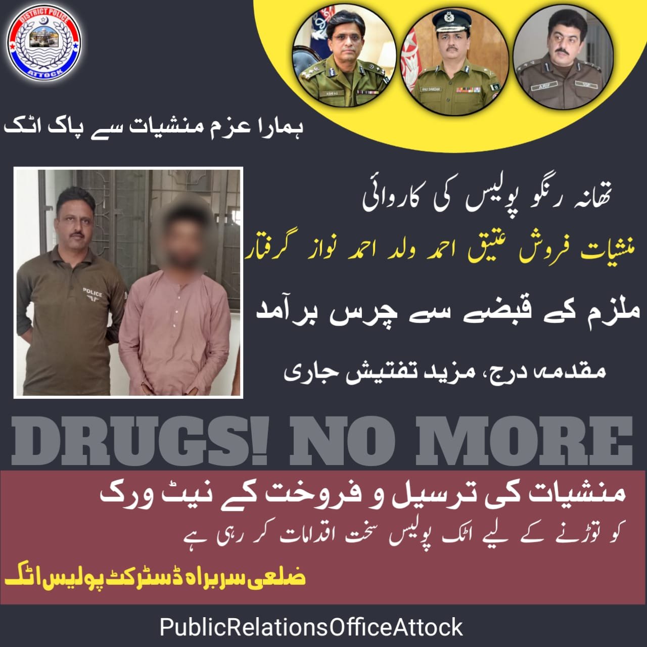 تھانہ رنگو پولیس نے جرائم پیشہ عناصر کےخلاف کاروائی کرتے ہوئے منشیات فروش عتیق احمد کو گرفتار کر لیا.