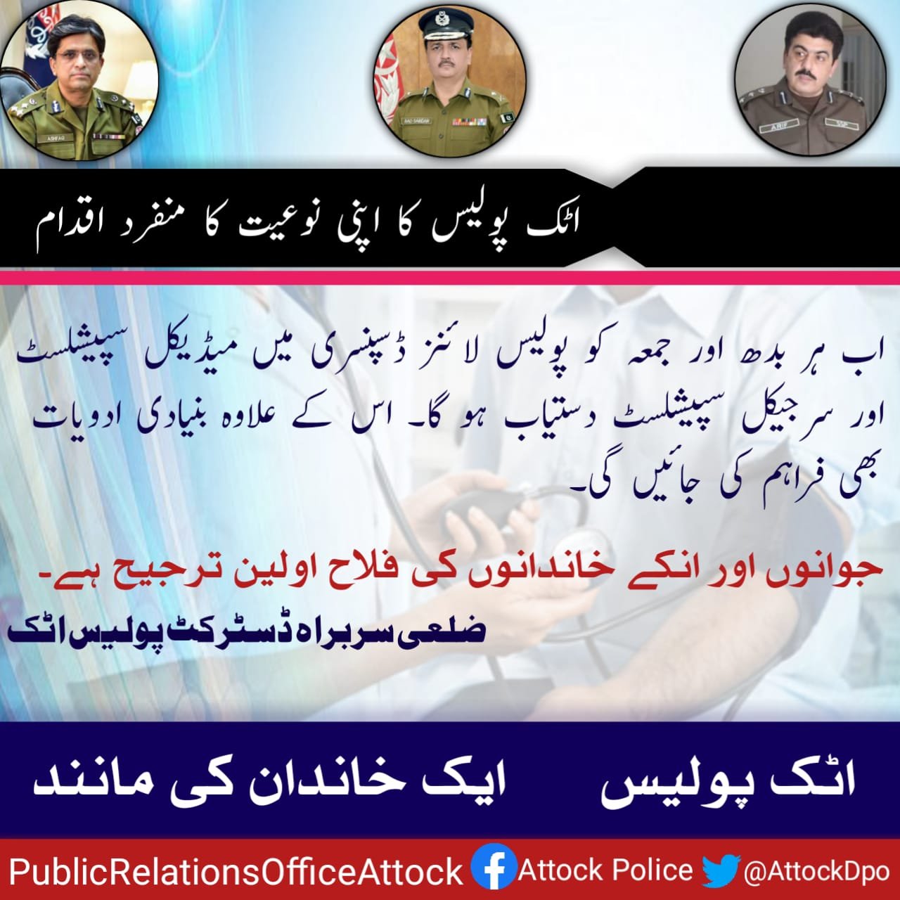 ہر بدھ اورجمعہ کو دن 11 بجے سے 12 بجے تک پولیس لائن اٹک ڈسپنسری میں ایک میڈیکل سپیشلسٹ اورایک سرجیکل سپیشلسٹ طبی معائنہ کریں گے۔