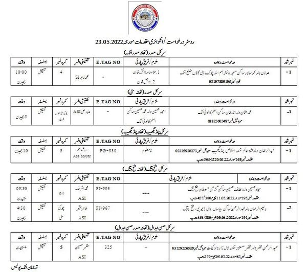 مورخہ 23.05.2022کو تھانہ جات میں تفتیش و انکوائری کے لیے طلب کیے جانے والے سائلین کے نام ذیل ہیں. May 23, 2022