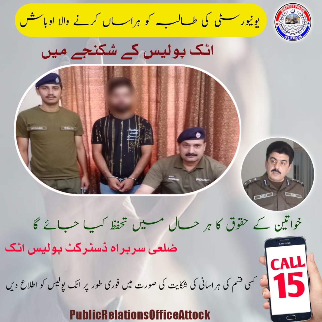 یونیورسٹی کی طالبہ کو چھیڑنے پر اوباش لڑکوں کے خلاف مقدمہ درج ، ایک ملزم گرفتار اٹک پولیس خواتین کے تحفظ کو ہر حال میں یقینی بنائے گی، ڈسٹرکٹ پولیس آفیسر اٹک May 23, 2022