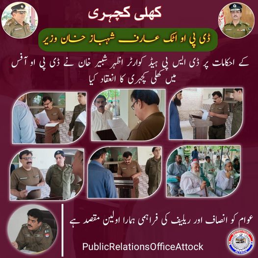ڈی پی او اٹک عارف شہباز خان وزیر کے احکامات پر ڈی ایس پی ہیڈ کوارٹر اظہر شبیر خان نے ڈی پی او آفس میں کھلی کچہری کا انعقاد کیا۔ May 24, 2022