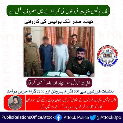 تھانہ صدراٹک پولیس کی بدنام زمانہ منشیات فروشوں کیخلاف کامیاب کاروائی،عادی منشیات فروش سدابہار اور عابد حسین گرفتار ملزمان کے قبضہ سے ہیرو ئین اور چرس بھاری مقدار میں برآمد،الگ الگ مقدمات درج ترجمان اٹک پولیس May 24, 2022