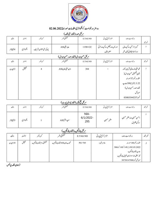 مورخہ 02.06.2022کو تھانہ جات میں تفتیش و انکوائری کے لیے طلب کیے جانے والے سائلین کے نام ذیل ہیں.