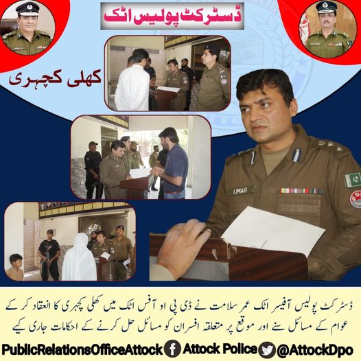 ڈسٹرکٹ پولیس آفیسراٹک نے ڈی پی اوآفس میں کھلی کچہری کا انعقاد کرکےعوام کے مسائل سنے اور موقع پر متعلقہ افسران کو حل کرنے کے احکامات جاری کیئے۔