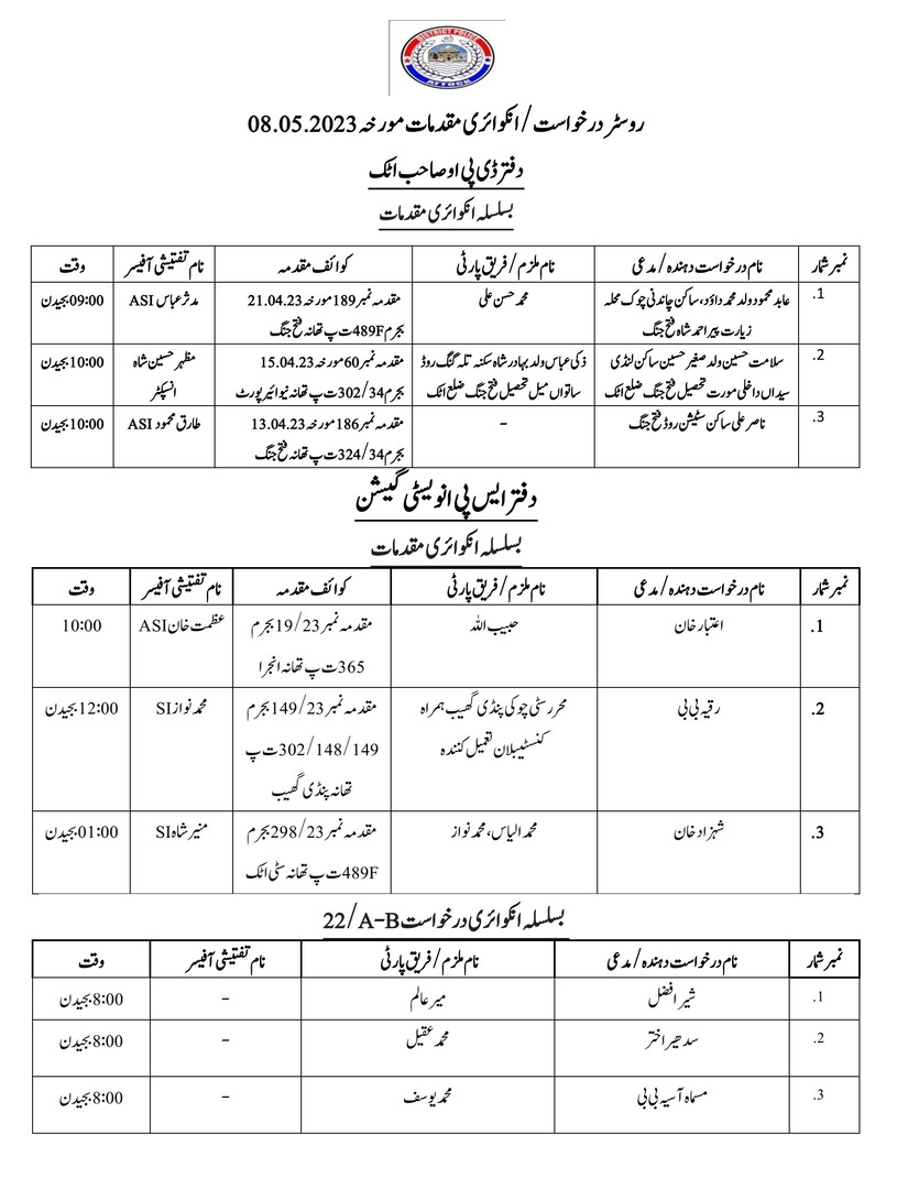 ڈی پی او آفس اٹک اور ضلع کے تمام ایس ٰٖڈی پی او آفس اور تھانہ جات میں بسلسلہ تفتیش اور انکوائری کے لیے بلوائے جانے والے سائلین اپنے نام نیچے دی گئیں فہرستوںمیں چیک کر سکتے ہیں اسکے علاوہ بذریعہ کال سروس متعلقہ تھانہ سے بھی آپ کو آگاہ کیا جا تا ہے۔اٹک پولیس اپنے آفیشل فیس بک پیج ،ٹویٹر اکاؤنٹ اور ویب سائٹ کے ذریعہ پبلک کو تمام تر معلومات روزانہ کی بنیاد پر فراہم کر رہی ہے ۔
