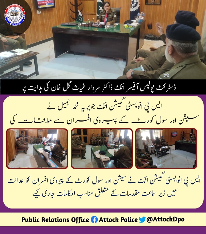 ایس پی انویسٹی گیشن اٹک جوریہ محمد جمیل نے سیشن اور سول کورٹ کے پیروی مقدمات پر تعینات پولیس افسران کے ساتھ ملاقات کی۔ May 12, 2023