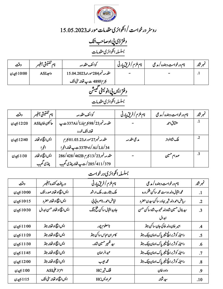 ڈی پی او آفس اٹک اور ضلع کے تمام ایس ٰٖڈی پی او آفس اور تھانہ جات میں بسلسلہ تفتیش اور انکوائری کے لیے بلوائے جانے والے سائلین اپنے نام نیچے دی گئیں فہرستوںمیں چیک کر سکتے ہیں اسکے علاوہ بذریعہ کال سروس متعلقہ تھانہ سے بھی آپ کو آگاہ کیا جا تا ہے۔اٹک پولیس اپنے آفیشل فیس بک پیج ،ٹویٹر اکاؤنٹ اور ویب سائٹ کے ذریعہ پبلک کو تمام تر معلومات روزانہ کی بنیاد پر فراہم کر رہی ہے۔