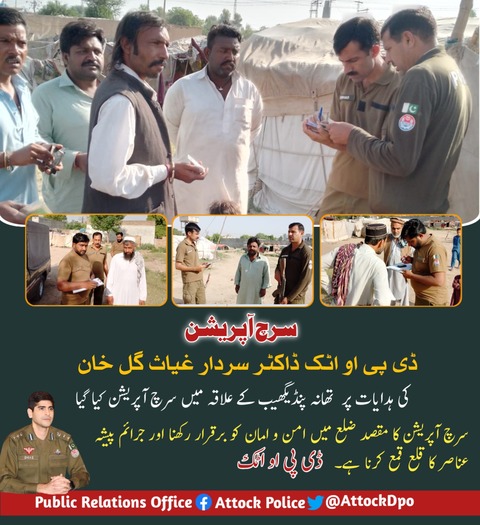 ڈی پی او اٹک ڈاکٹر سردار غیاث گل خان کی ہدایات پر تھانہ پنڈیگھیب کے علاقہ میں سرچ آپریشن