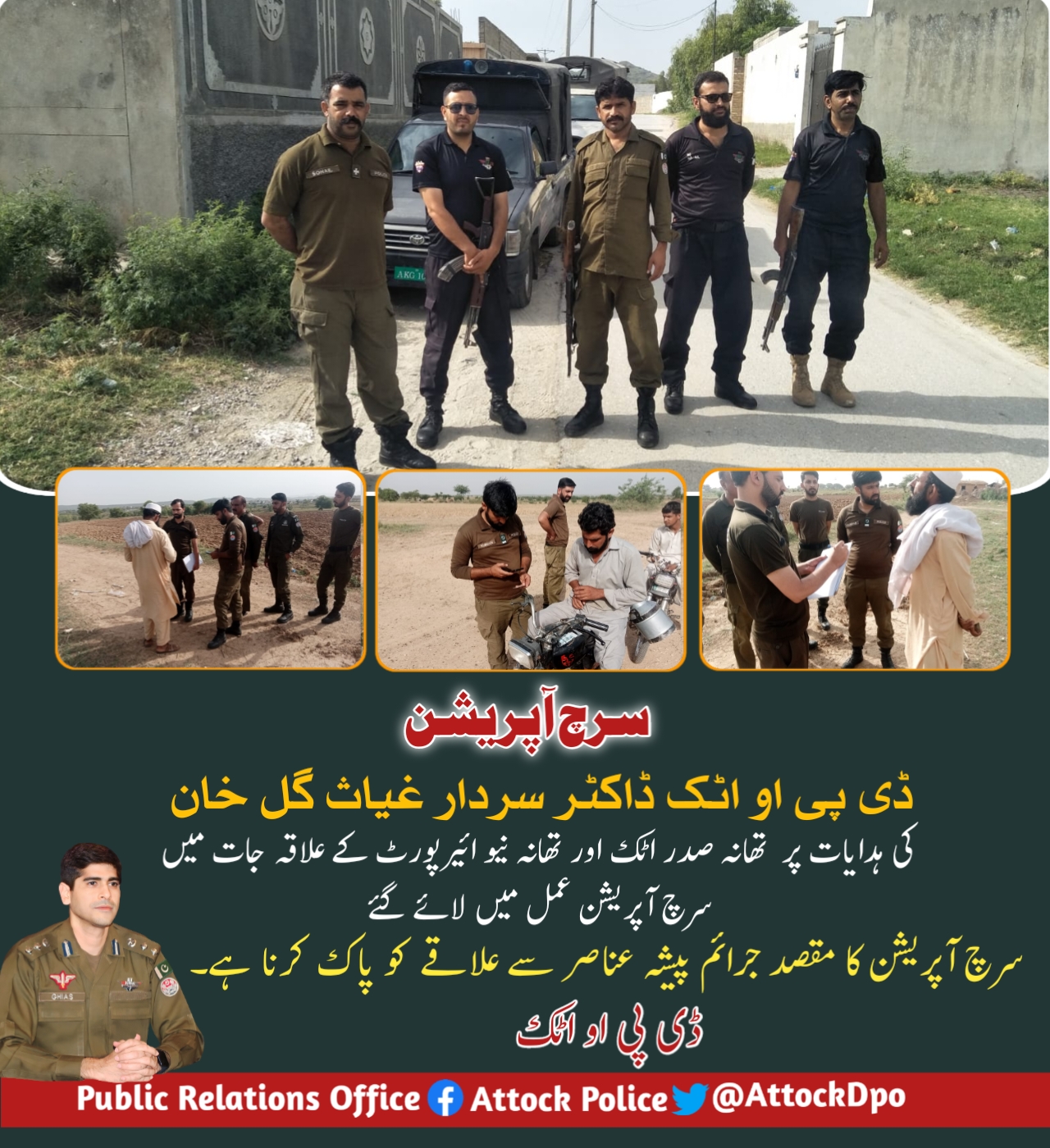 ڈی پی او اٹک ڈاکٹر سردار غیاث گل خان کی ہدایات پر تھانہ صدر اٹک اور تھانہ نیو ائیرپورٹ کے علاقہ جات میں سرچ آپریشن