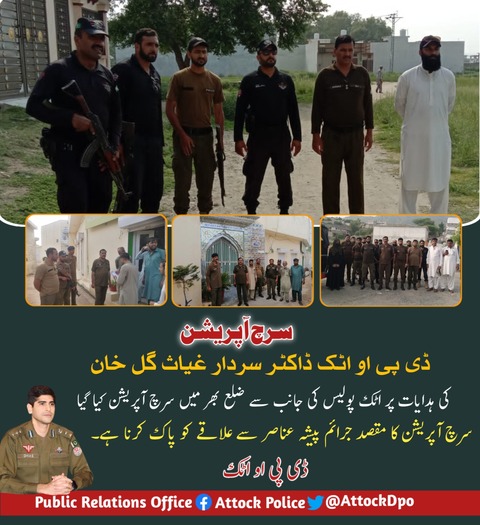 ڈی پی او اٹک ڈاکٹر سردار غیاث گل خان کی ہدایات پر اٹک پولیس کی جانب سے ضلع بھر میں سرچ آپریشن کیا گیا