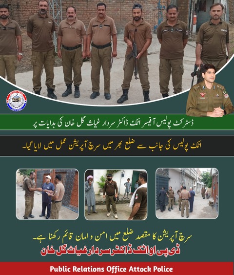ڈی پی او اٹک ڈاکٹر سردار غیاث گل خان کی ہدایات پر اٹک پولیس کی جانب سے ضلع بھر میں سرچ آپریشن کیا گیا
