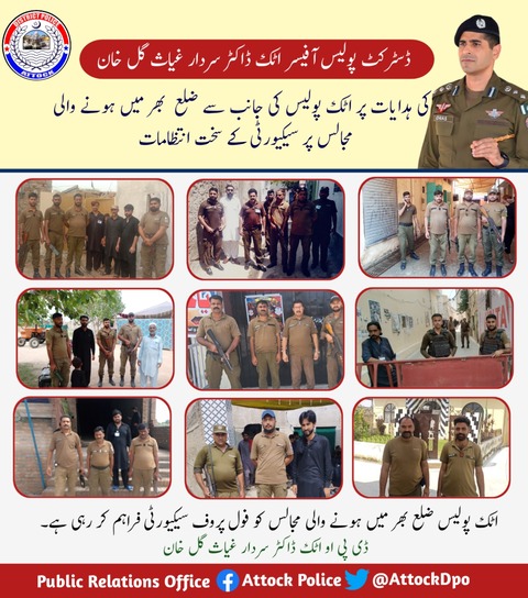 ڈٰی پی او اٹک ڈاکٹر سردار غیاث گل خان کی ہدایات پر اٹک پولیس کی جانب سے ضلع بھر میں ہونے والی مجالس میں سیکیورٹی کے سخت انتظامات