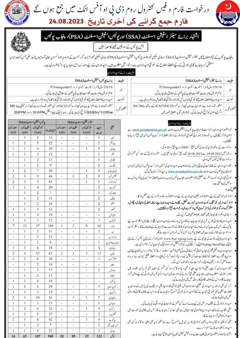 اشتہار برائے بھرتی سنئیر سٹیشن اسسٹنٹ(SSA) اور پولیس اسٹیشن اسسٹنٹ (PSA)، پنجاب پولیس فارم ڈاؤن لوڈ کرنے کے لیے دئیے گئے لنگ پر کلک کریں Aug 16, 2023