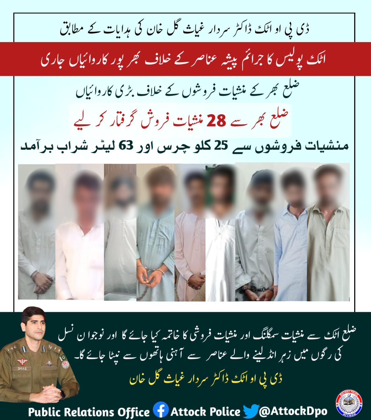 اٹک پولیس کی جانب سے ضلع بھر میں منشیات فروشوں کے خلاف کریک ڈاؤن جاری