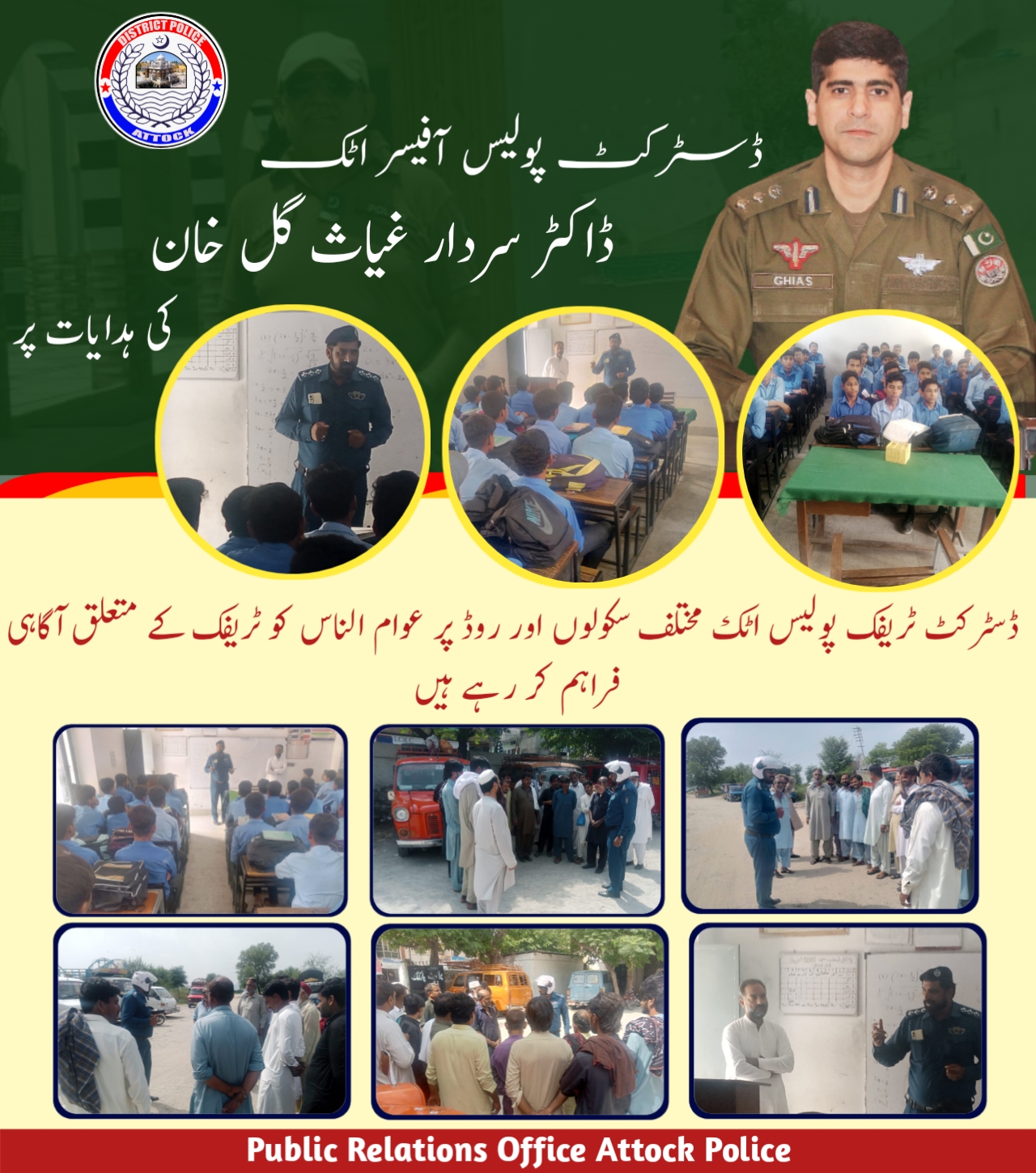 ڈی پی او اٹک ڈاکٹر سردار غیاث گل خان کی ہدایات پر ڈسٹرکٹ ٹریفک پولیس اٹک کی جانب سے مختلف سکولوں اور روڈ پر عوام الناس کو ٹریفک کے متعلق آگاہی فراہم کی جا رہی ہے