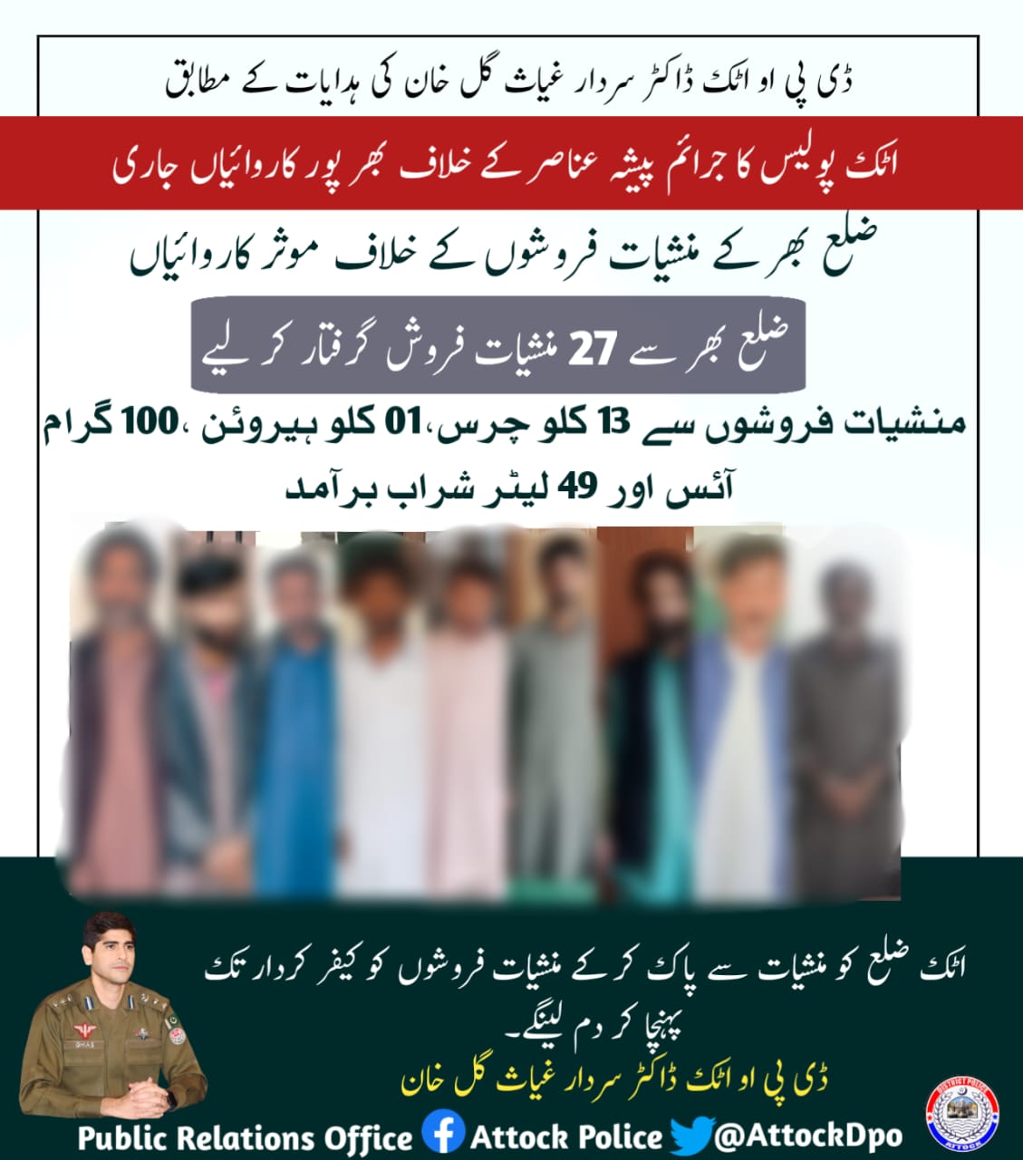 اٹک پولیس کی جانب سے ضلع بھر کے منشیات فروشوں کے خلاف کامیاب کاروائیاں جاری ہیں