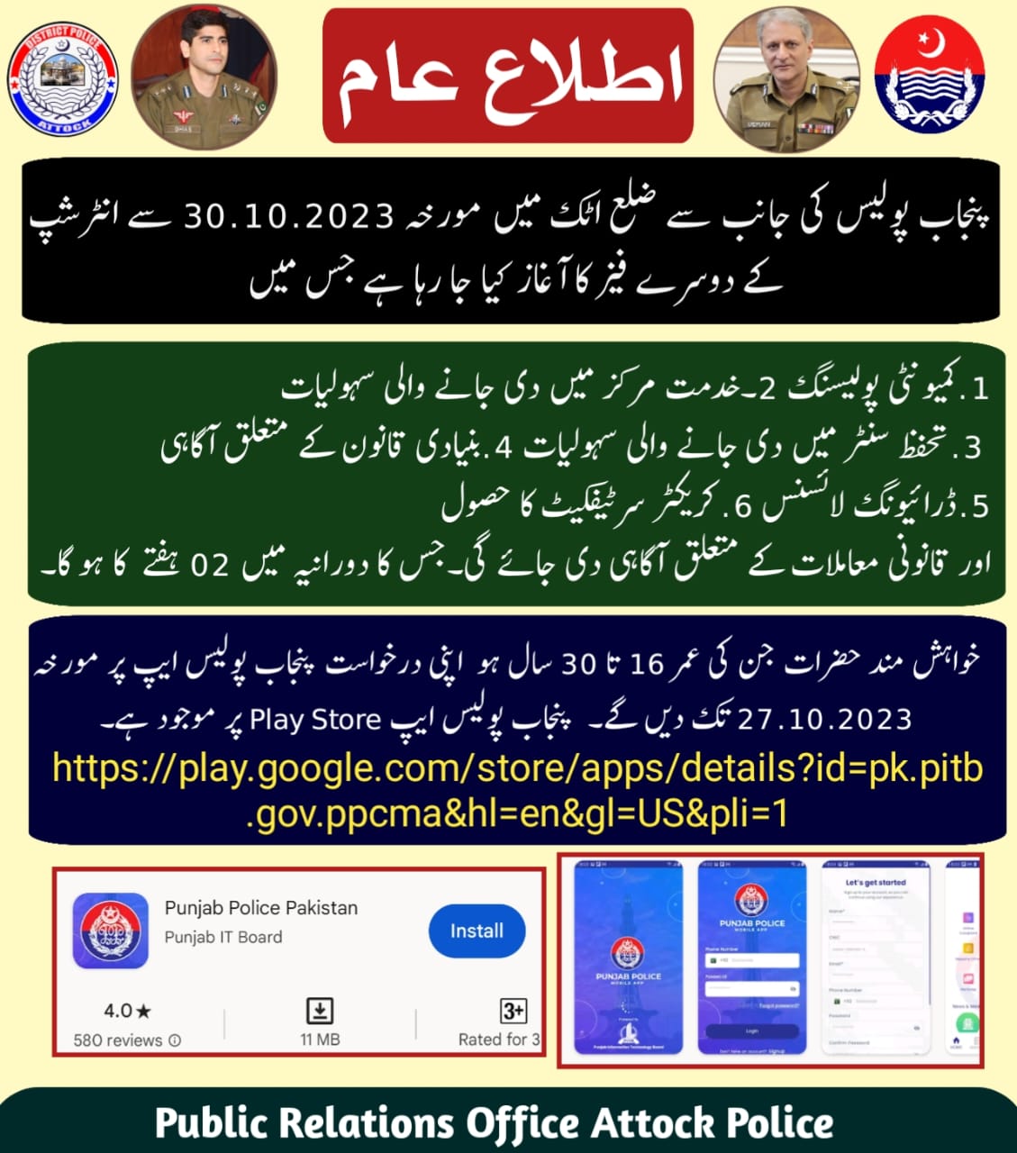 پنجاب پولیس کی جانب سے ضلع اٹک میں مورخہ 30.10.2023 سے انٹرنشپ کے دوسرے فیز کا آغاز کیا جا رہا ہے