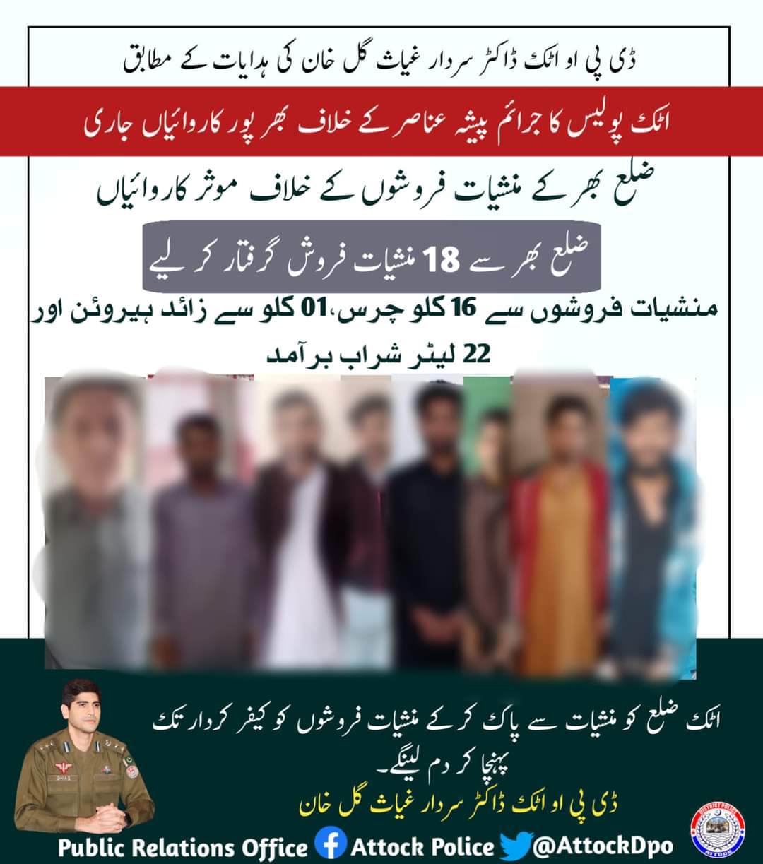 اٹک پولیس کی جانب سے ضلع بھر میں منشیات فروشوں کے خلاف کامیاب کاروائیاں جاری،