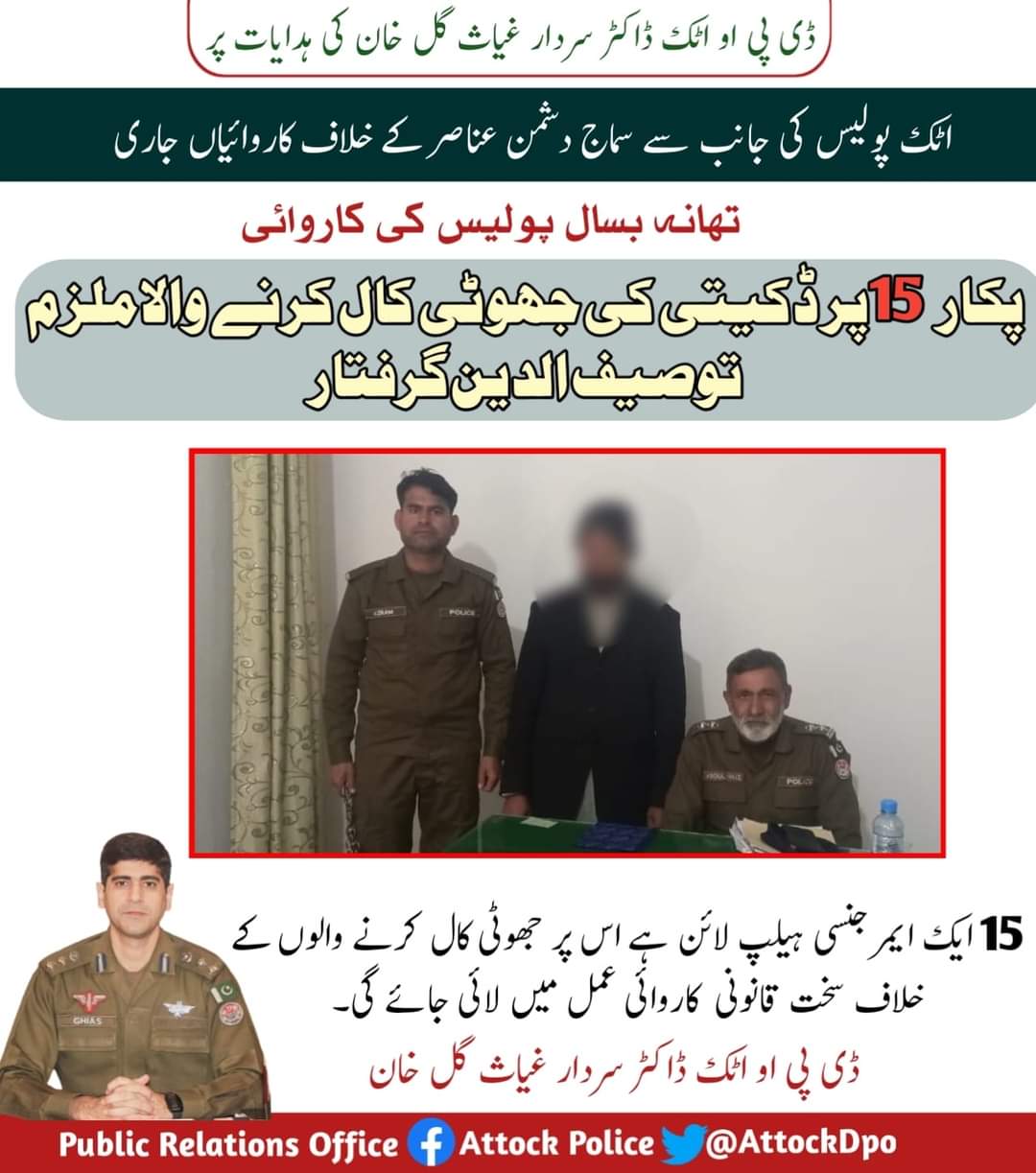 تھانہ بسال پولیس کی کاروائی، پکار 15 پر ڈکیتی کی جھوٹی کال کرنے والا ملزم توصیف الدین گرفتار