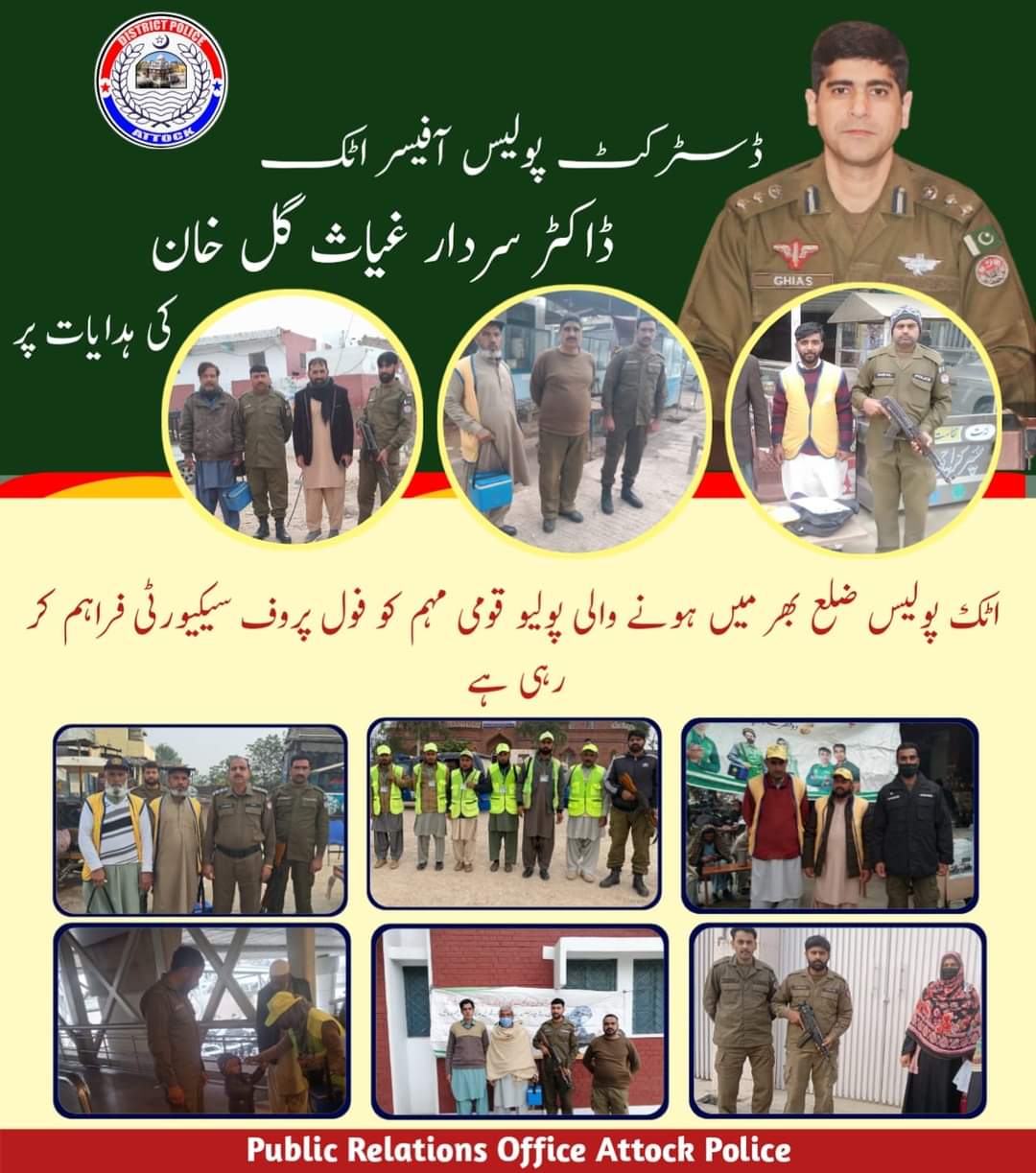 ڈسٹرکٹ پولیس آفیسر اٹک ڈاکٹر سردار غیاث گل خان کی ہدایات پر اٹک پولیس ضلع بھر میں ہونے والی پولیو قومی مہم کو فول پروف سیکیورٹی فراہم کر رہی ہے،