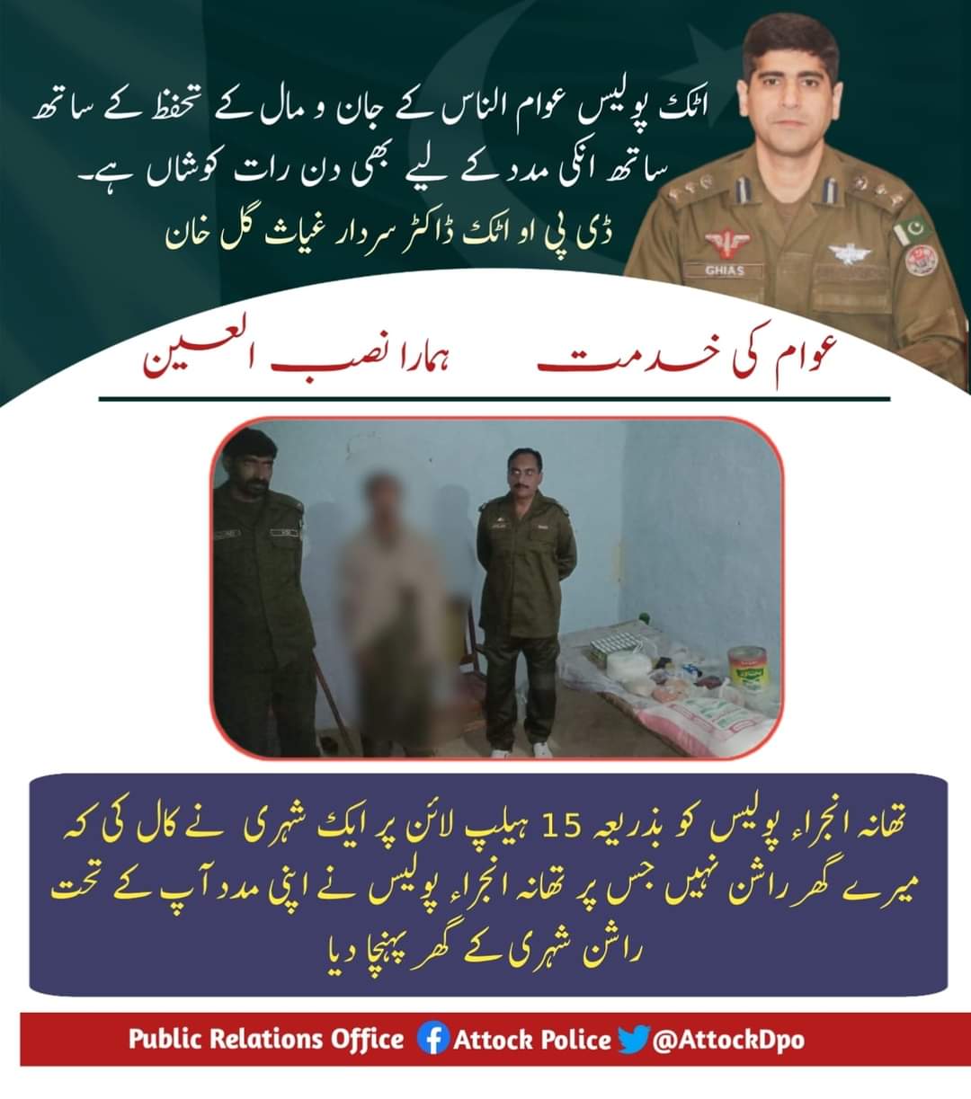 عوام کی خدمت ہمارا نصب العین تھانہ انجراء پولیس کو بذریعہ 15 ہیلپ لائن پر ایک شہری نے کال کی کہ میرے گھر راشن نہیں جس پر تھانہ انجراء پولیس نے اپنی مدد آپ کے تحت راشن شہری کے گھر پہنچا دیا،