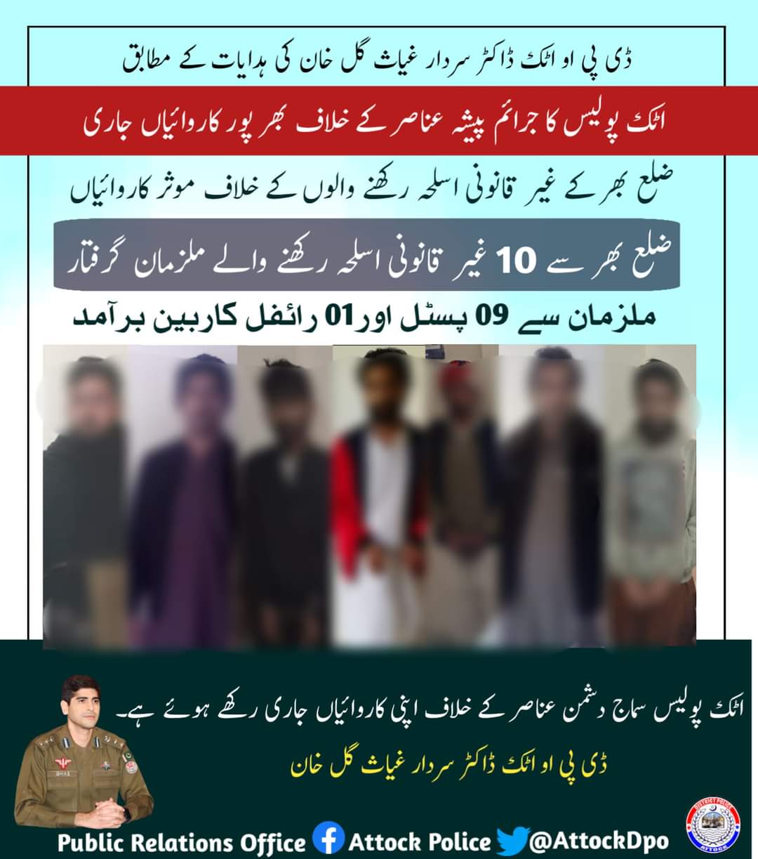 ڈی پی او اٹک ڈاکٹر سردار غیاث گل خان کی ہدایات کے مطابق اٹک پولیس کا جرائم پیشہ عناصر کے خلاف بھر پور کاروائیاں جاری، ضلع بھر کے غیر قانونی اسلحہ رکھنے والوں کے خلاف موثر کاروائیاں، ضلع بھر سے 10 غیر قانونی اسلحہ رکھنے والے ملزمان گرفتار، ملزمان سے 09 پسٹل اور 01 رائفل کاربین برآمد، ترجمان اٹک پولیس‎
