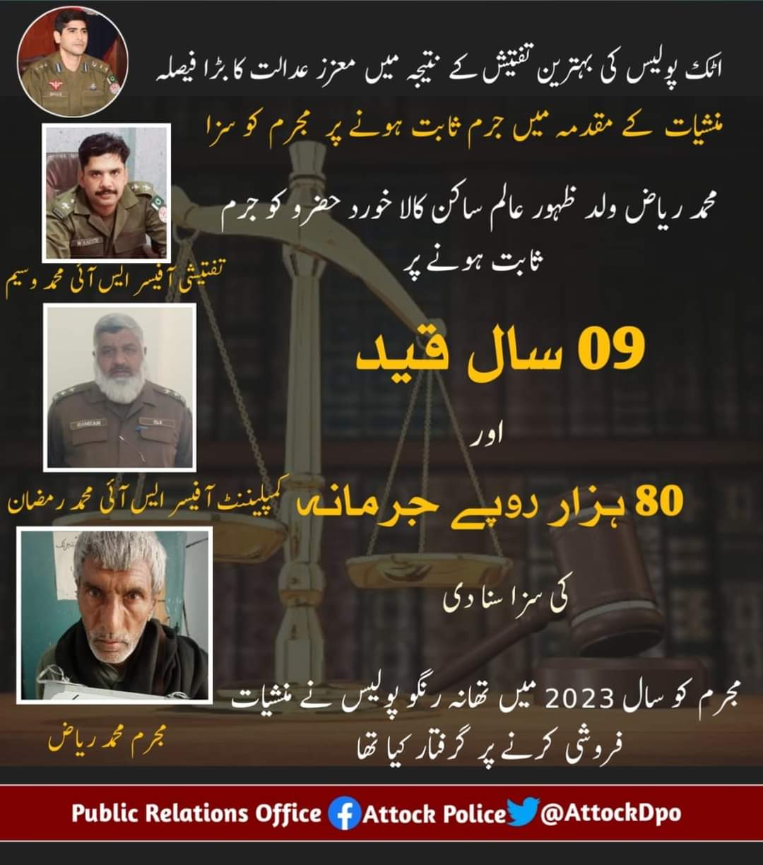 اٹک پولیس کی بہترین تفتیش کے نتیجے میں معزز عدالت نے منشیات فروش محمد ریاض ولد ظہور عالم سکنہ کالوخورد علاقہ تھانہ رنگو کو 9 سال قید اور 80000 روپے نقد جرمانے کی سزا سنا دی ۔ ترجمان اٹک پولیس