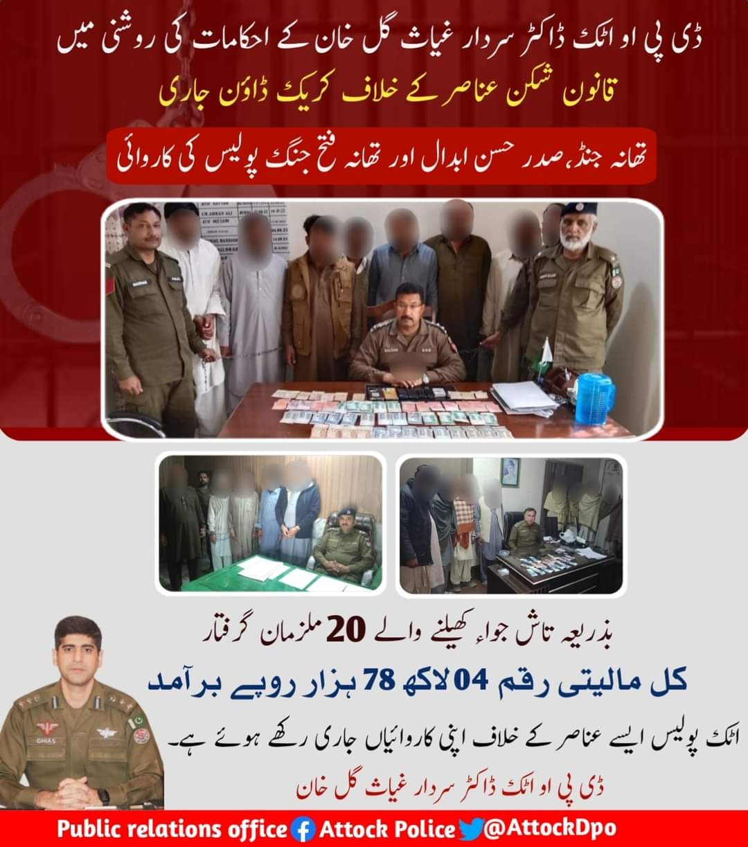 ڈی پی او اٹک ڈاکٹر سردار غیاث گل خان کے احکامات کی روشنی میں قانون شکن عناصر کے خلاف کریک ڈاؤن جاری، تھانہ جنڈ،صدر حسن ابدال اور تھانہ فتح جنگ پولیس کی کاروائی، بذریعہ تاش جواء کھیلنے والے 20 ملزمان گرفتار، کل مالیتی رقم 04 لاکھ 78 ہزار روپے برآمد، اٹک پو