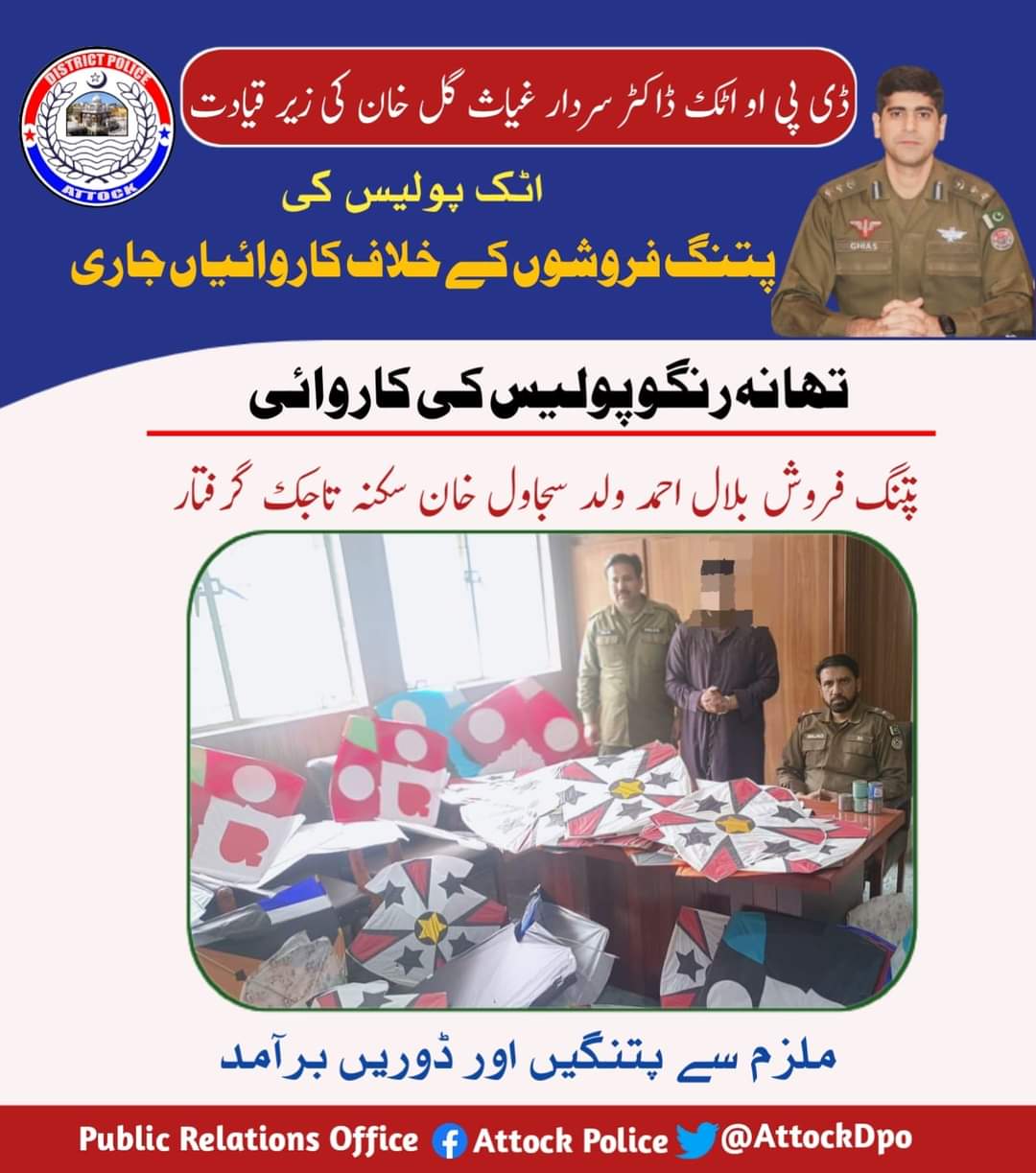 ڈی پی او اٹک ڈاکٹر سردار غیاث گل خان کی زیر قیادت اٹک پولیس کی پتنگ فروشوں کے خلاف کاروائیاں جاری،