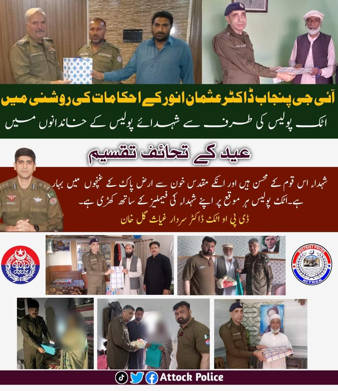 آئی جی پنجاب ڈاکٹر عثمان انور کے احکامات کی روشنی میں اٹک پولیس کی طرف سے شہدائے پولیس کے خاندانوں میں عید کے تحائف تقسیم، شہداء اس قوم کے محسن ہیں اور انکے مقدس خون سے ارض پاک کے غنچوں میں بہار ہے۔اٹک پولیس ہر موقع پر اپنے شہداء کی فیملیز کے ساتھ کھڑی ہے