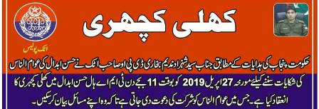ڈسٹرکٹ پولیس آفیسر اٹک سید شہزاد ندیم بخاری مورخہ 27.04.2019 کو دن 11 بجےٹی ایم اے ہال حسن ابدال میں کھلی کچہری کا انعقاد کریں گے۔
