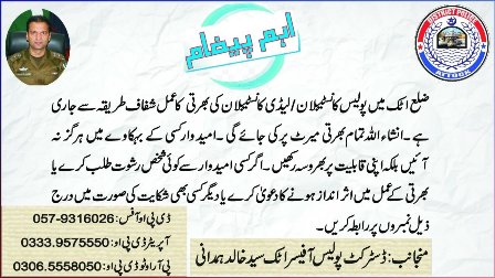 کانسٹیبلان کی بھرتی کے عمل میں 100فیصد میرٹ کو ہر حال میں یقینی بنایا جائے گا ۔امیدواران کسی نو سر باز کے جھانسے میں نہ آئیں ۔