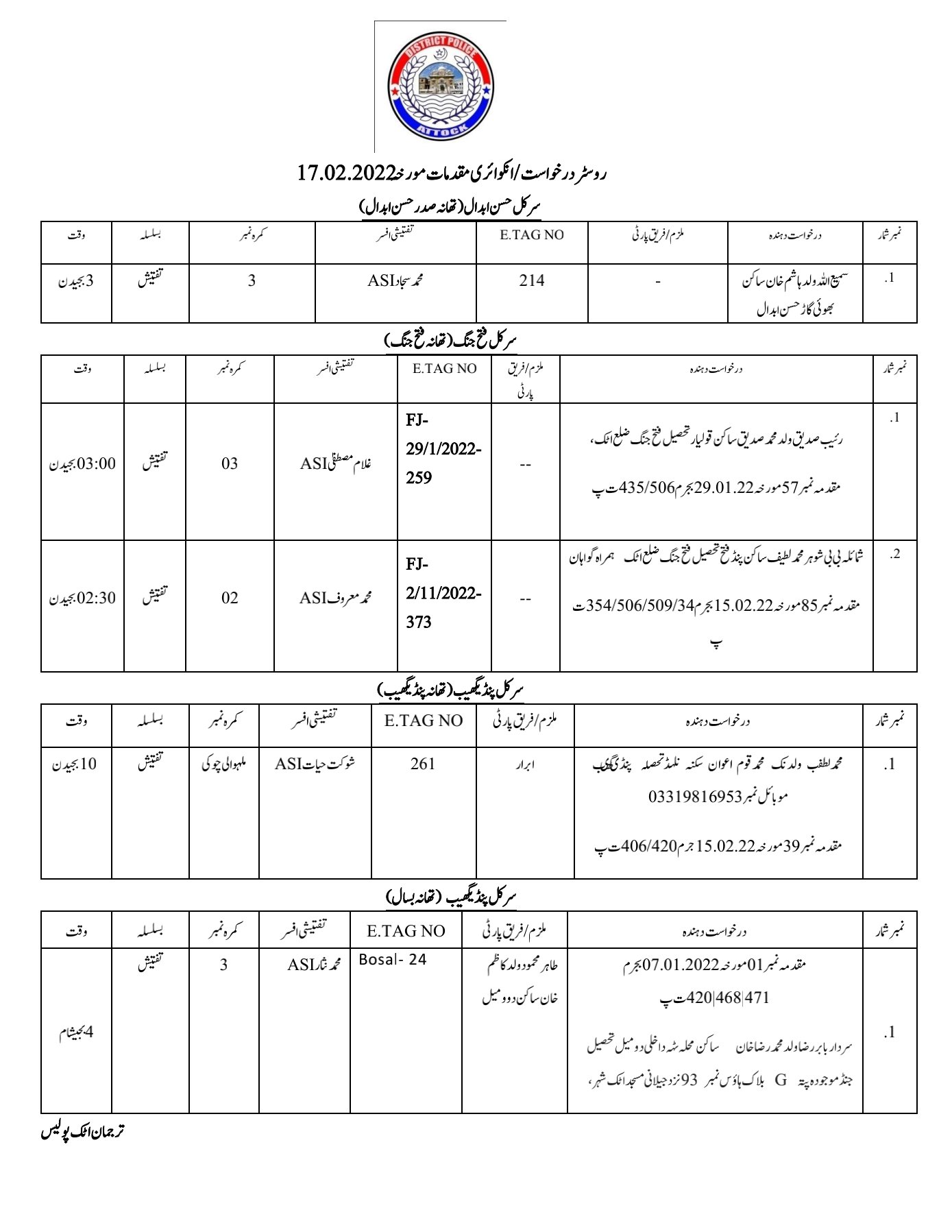تھانہ جات میں تفتیش و انکوائری کے لیے طلب کیےجانے والے سائلین کے نام ذیل ہیں