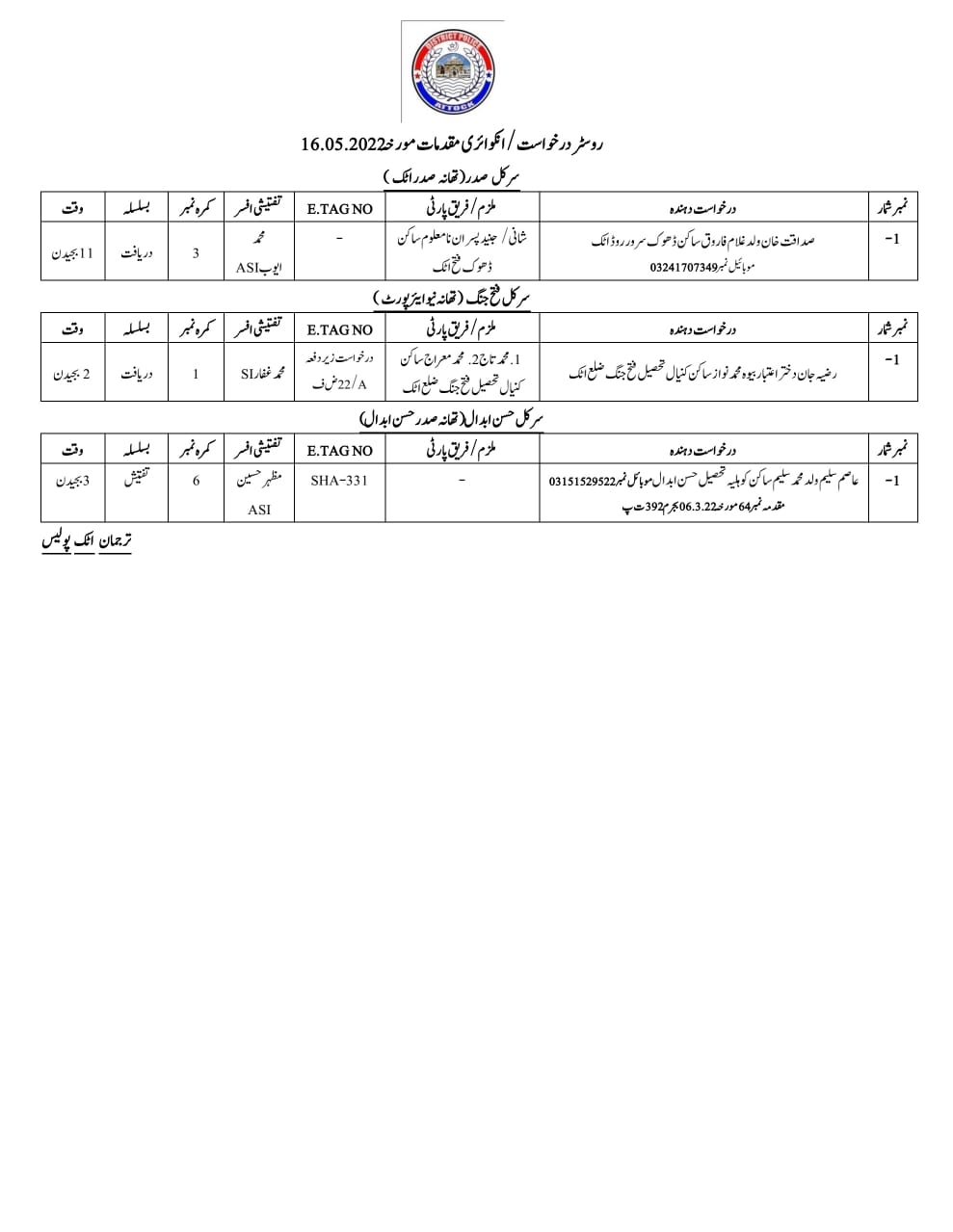 مورخہ 16.05.2022کو تھانہ جات میں تفتیش و انکوائری کے لیے طلب کیے جانے والے سائلین کے نام ذیل ہیں.