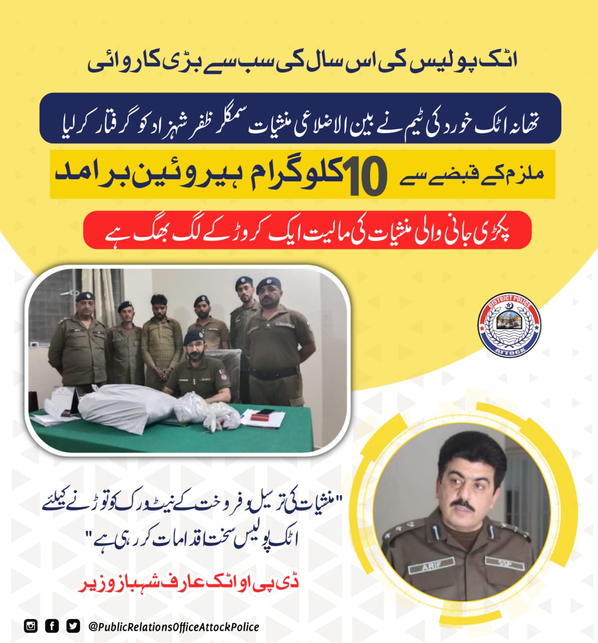 منشیات فرو شی جیسے گھناؤنے جرم کا راستہ روکنے اور اس مذموم دھندے میں ملوث ملزمان کی گرفتاری کے لیے اٹک پولیس تمام وسائل بروئے کار لائے گی۔ڈی پی او اٹک عارف شہباز خان وزیر
