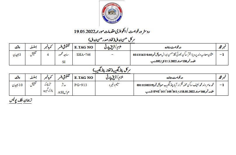 مورخہ 19.05.2022کو تھانہ جات میں تفتیش و انکوائری کے لیے طلب کیے جانے والے سائلین کے نام ذیل ہیں. ترجمان اٹک پولیس May 19, 2022