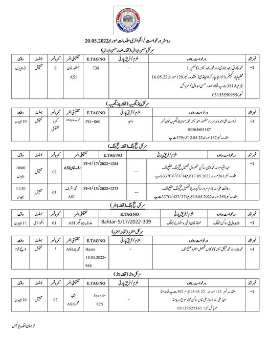 مورخہ 20.05.2022کو تھانہ جات میں تفتیش و انکوائری کے لیے طلب کیے جانے والے سائلین کے نام ذیل ہیں. May 20, 2022