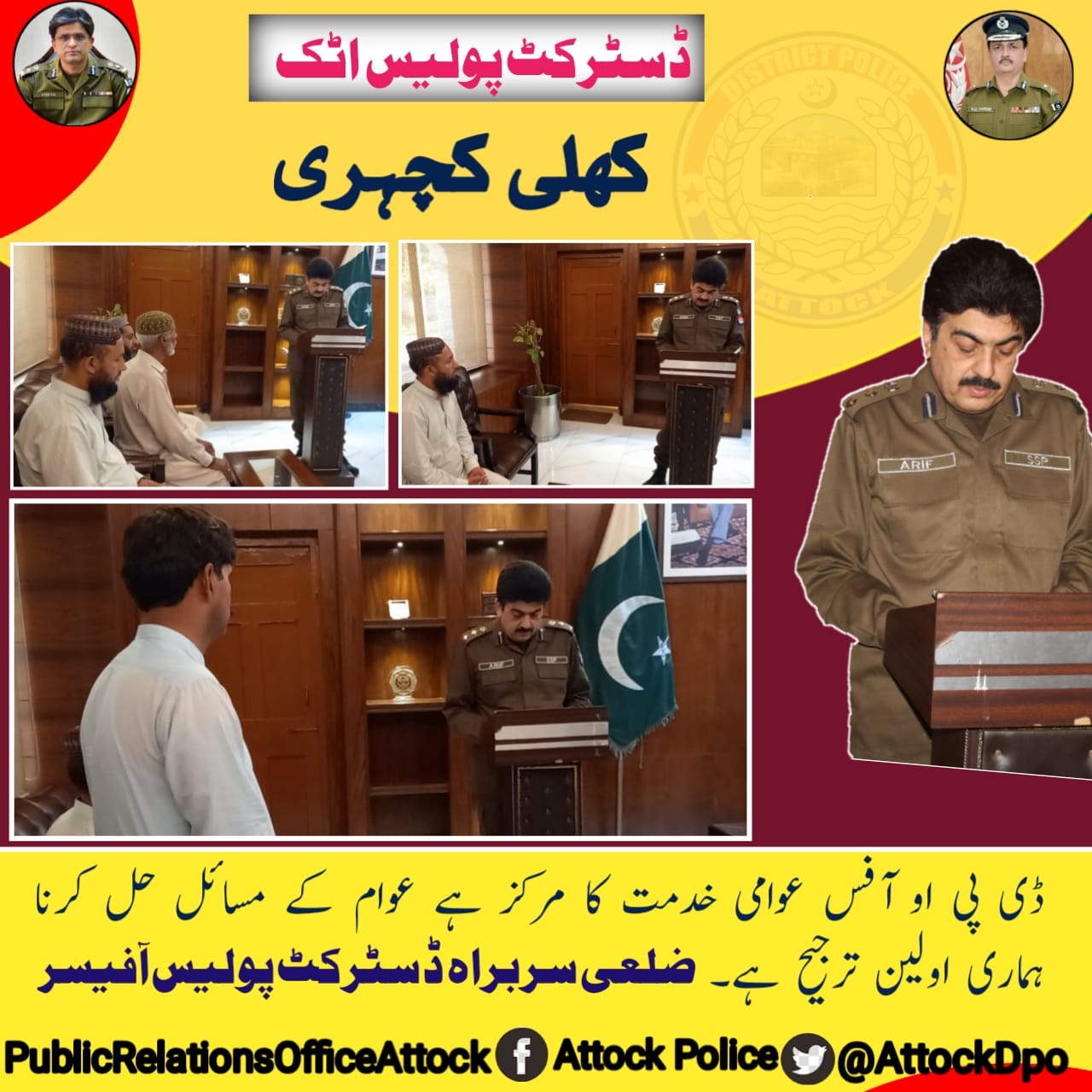 ڈی پی او اٹک عارف شہباز خان وزیر نے اپنے دفتر میں کھلی کچہری کا انعقاد کر کے عوام الناس کے مسائل سنے اور موقع پر متعلقہ افسران کو مسائل حل کرنے کے احکامات جاری کیے۔