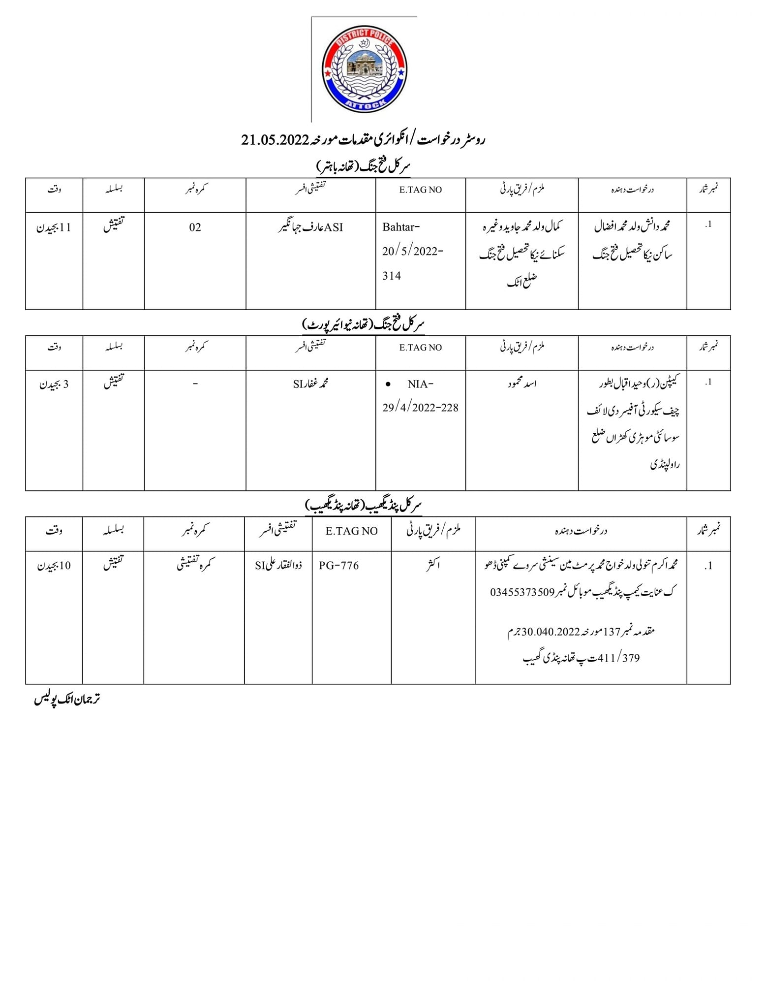 مورخہ 21.05.2022کو تھانہ جات میں تفتیش و انکوائری کے لیے طلب کیے جانے والے سائلین کے نام ذیل ہیں. May 21, 2022