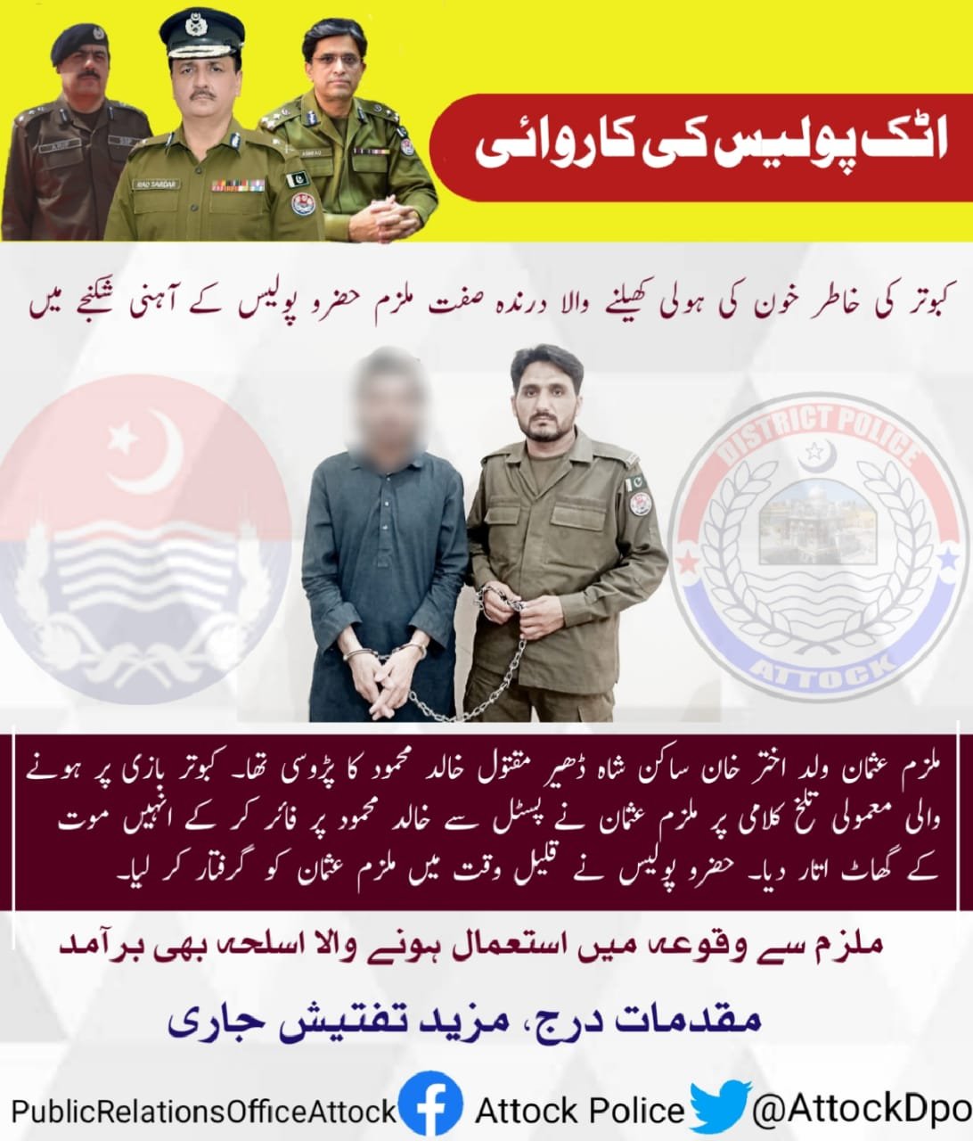 انچارج ایچ آئی یو سرکل حضرو سب انسپکٹر حارث عمیر نے قتل کے ملزم کو گرفتار کر لیا۔ آلہ قتل اسلحہ ناجائز پسٹل9MM برآمد کر لیا۔ May 21, 2022