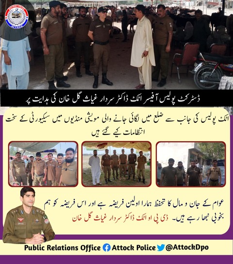 ڈسٹرکٹ پولیس آفیسر اٹک ڈاکٹر سردار غیاث گل کی ہدایات پر اٹک پولیس کی جانب سے ضلع میں لگائی جانے والی مویشی منڈیوں میں سیکیورٹی کے سخت انتظامات کیے گئے ہیں،