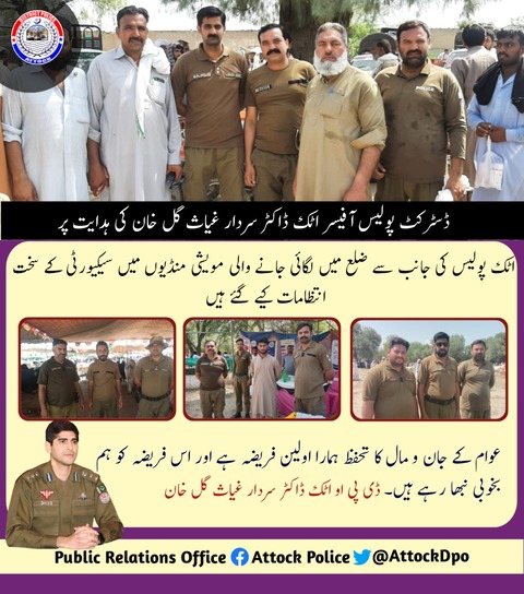 ڈی پی او اٹک ڈاکٹر سردار غیاث گل خان کی ہدایات پر ضلع بھر میں لگائی جانے والی مویشی منڈٰیوں میں سیکیورٹی کے سخت انتظامات کیے گئے ہیں