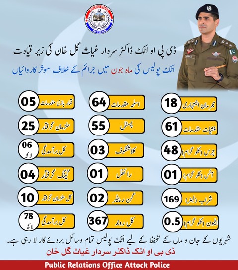 ڈی پی او اٹک ڈاکٹر سردار غیاث گل خان کی زیر قیادت اٹک پولیس کی ماہ جون میں جرائم کے خلاف موثر کاروائیاں