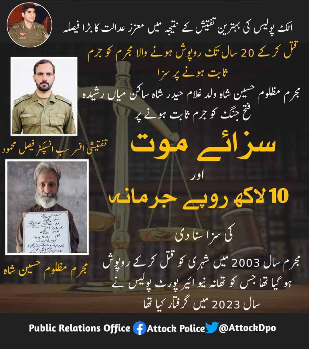 اٹک پولیس کی بہترین تفتیش کے نتیجہ میں معزز عدالت کا بڑا فیصلہ، مجرم مظلوم حسین شاہ ولد غلام حیدر شاہ ساکن میاں رشیدہ فتح جنگ کو جرم ثابت ہونے پر سزائے موت اور 10 لاکھ روپے جرمانہ کی سزا سنا دی، ترجمان اٹک پولیس