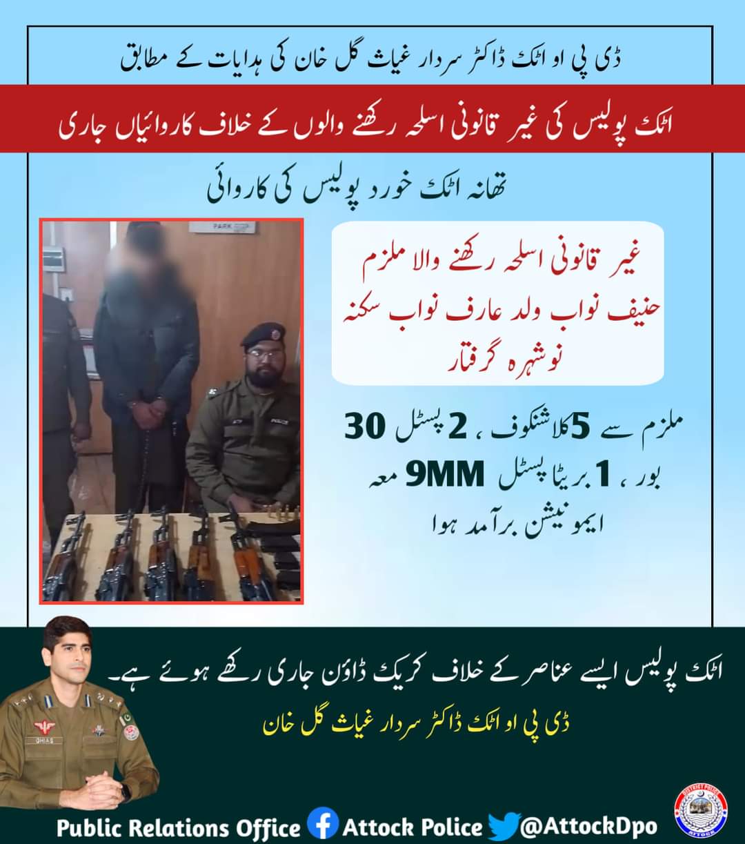 تھانہ اٹک خورد پولیس کی کاروائی، غیر قانونی اسلحہ رکھنے والا ملزم حنیف نواب ولد عارف نواب سکنہ نوشہرہ گرفتار، ملزم سے 5کلاشنکوف ، 2 پسٹل 30 بور ، 1 بریٹا پسٹل 9MM معہ ایمونیشن برآمد، ترجمان اٹک پولیس