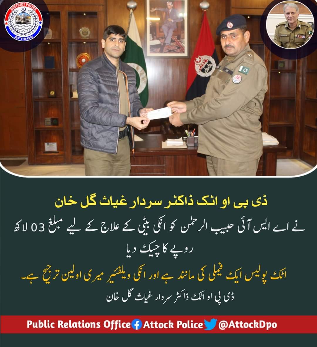ڈی پی او اٹک ڈاکٹر سردار غیاث گل خان نے اے ایس آئی حبیب الرحمٰن کو انکی بیٹی کے علاج کے لیے مبلغ 03 لاکھ روپے کا چیک دیا، اٹک پولیس ایک فیملی کی مانند ہے اور انکی ویلفئیر میری اولین ترجیح ہے،ڈی پی او اٹک ڈاکٹر سردار غیاث گل خان ترجمان اٹک پولیس